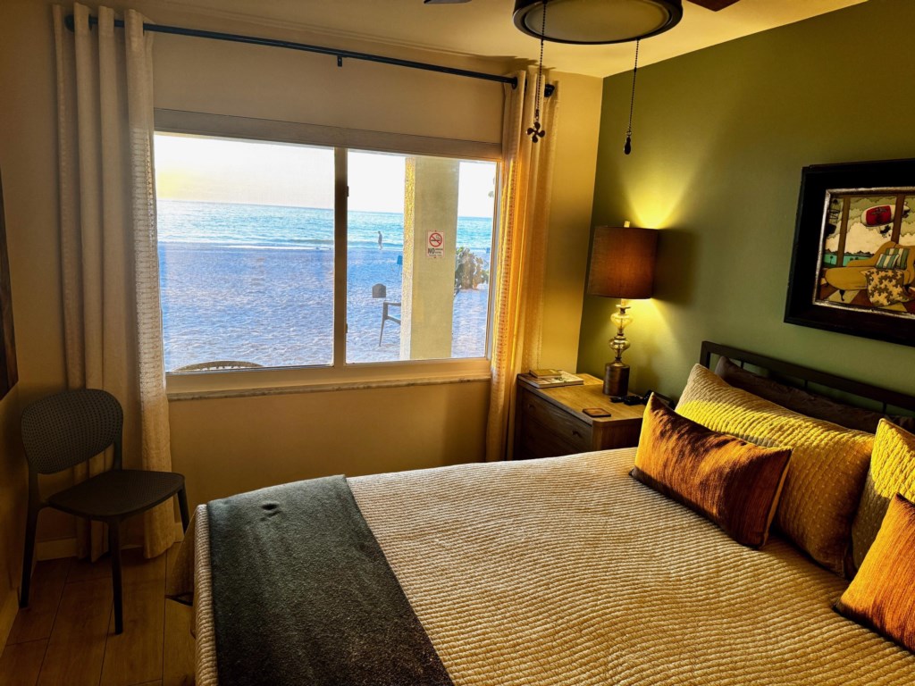 Open plan with amazing kitchen. Beautiful view of the waves and the beach right outside your window. Grab your towel, take a few steps and you're on the beach. The sand comes right up to your door in this ground floor unit. Yes, that is the view from your living room and bedroom.